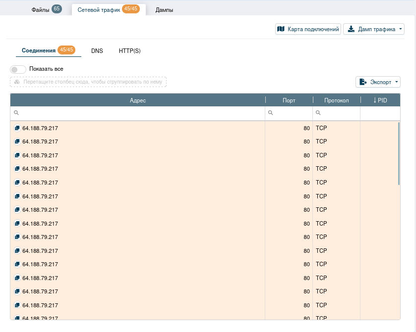В разделе «Сетевой трафик» отображаются все подключения в интернет, зафиксированные во время динамического исследования файла. Если строки подсвечены оранжевым или красным, значит IP-адрес, к которому было подключение, с высокой вероятностью находится в блок-листе.