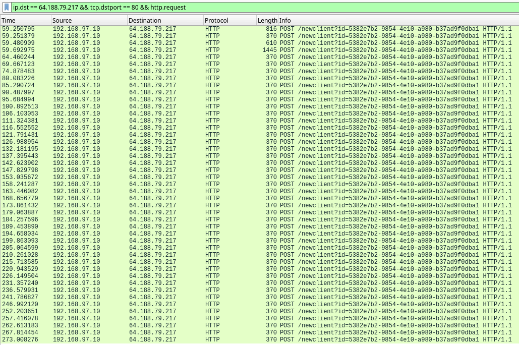 /newclient?id=<UUID>. Запросы повторяются с фиксированными интервалами и имеют большие Content-Length. - Заголовок