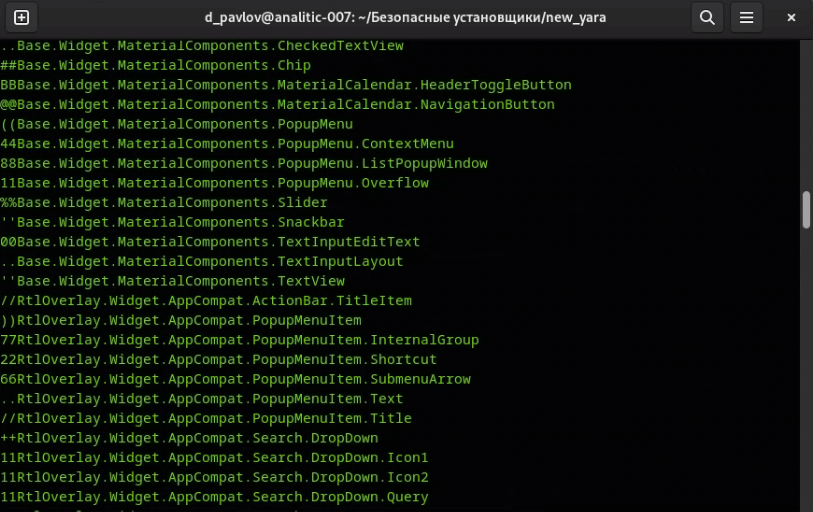 Итого были извлечены текстовые строки длиной от 6 символов. Результаты показали наличие множества системных ресурсов Android (Base.Widget.*), однако следов http, apezdolskynet или Base64-строк в открытом виде найдено не было. Это может указывать на то, что содержимое .dex-файлов упаковано или обфусцировано, а строки шифруются и расшифровываются во время исполнения.