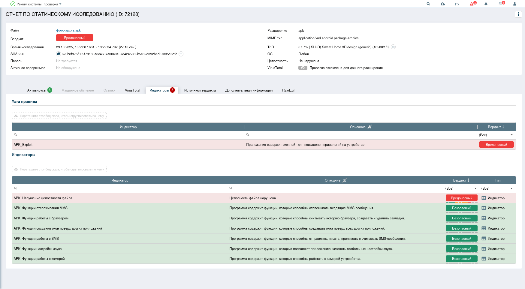 Во вкладке «Индикаторы» отработало одно Yara-правило и несколько статических индикаторов.
