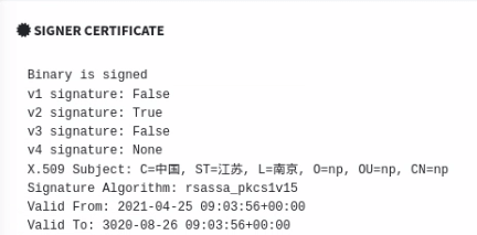Первое на что стоит обратить внимание, это то, что приложение скорее всего подписано самописным сертификатом, сроком действия до 2030 года.