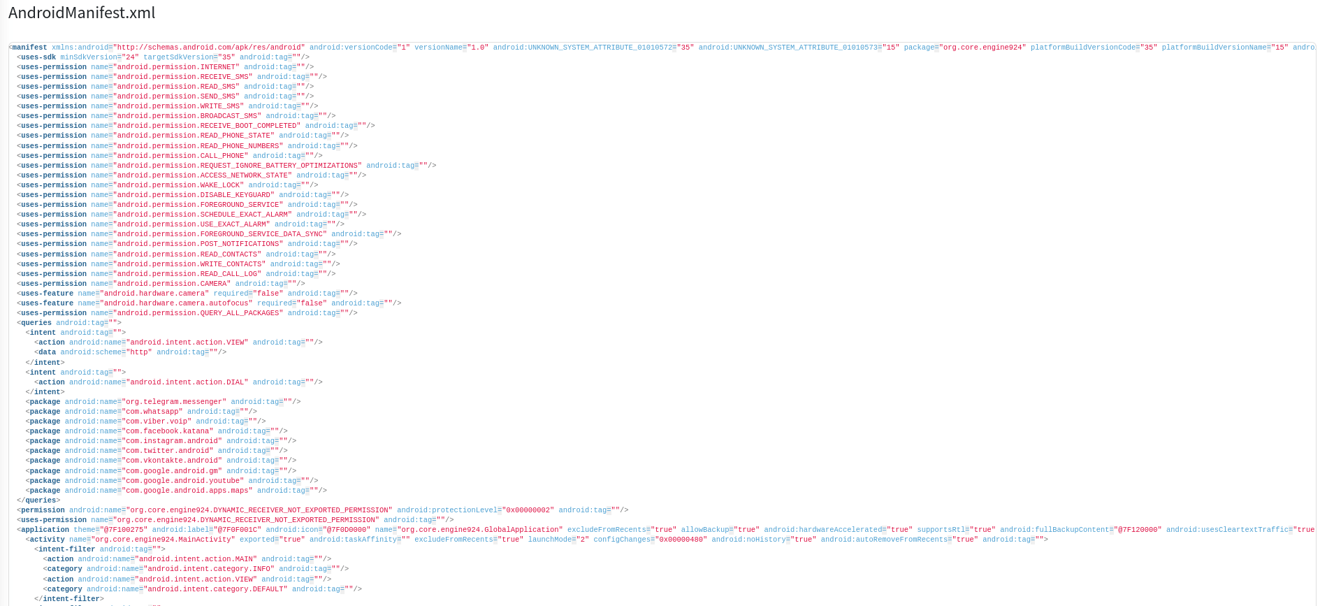 READ_SMS, SEND_SMS, WRITE_SMS, RECEIVE_SMS— полный контроль над SMSREAD_PHONE_STATE, READ_PHONE_NUMBERS, CALL_PHONE— доступ к информации о SIM и возможность совершать звонкиCAMERA, READ_CONTACTS, WRITE_CONTACTS— доступ к персональным данным и камереRECEIVE_BOOT_COMPLETED— автозапуск при включении устройства (персистентность)INTERNET, ACCESS_NETWORK_STATE— сетевое взаимодействиеREQUEST_IGNORE_BATTERY_OPTIMIZATIONS— предотвращение выгрузки из памяти