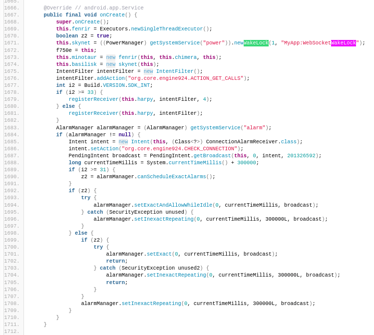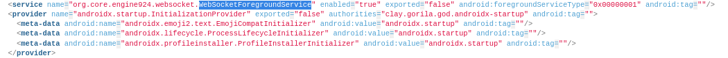 Помимо этого, манифест указывает на использование компонента WebSocketForegroundService — именно он отвечает за установку постоянного соединения с сервером управления.