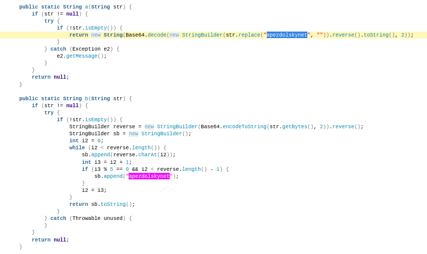 apezdolskynet. Полезная нагрузка кодируется в Base64, затем разворачивается и каждые 5 символов вставляется маркер. При декодировании последовательность удаляется и строкаreverse() → Base64.decode - Набор ключевых классов/функций: