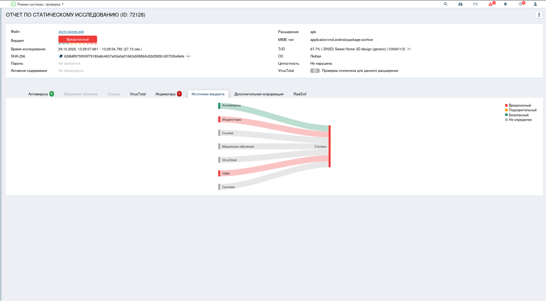 Во вкладке «Источники вердикта» строится графическая карта с источниками и их вердиктами, а также общим вердиктом по исследуемому файлу.