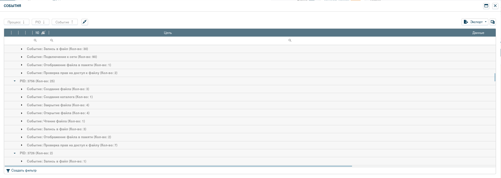 В блоке события можно детально изучить процессы и данные, которые были собраны в ходе исследования.