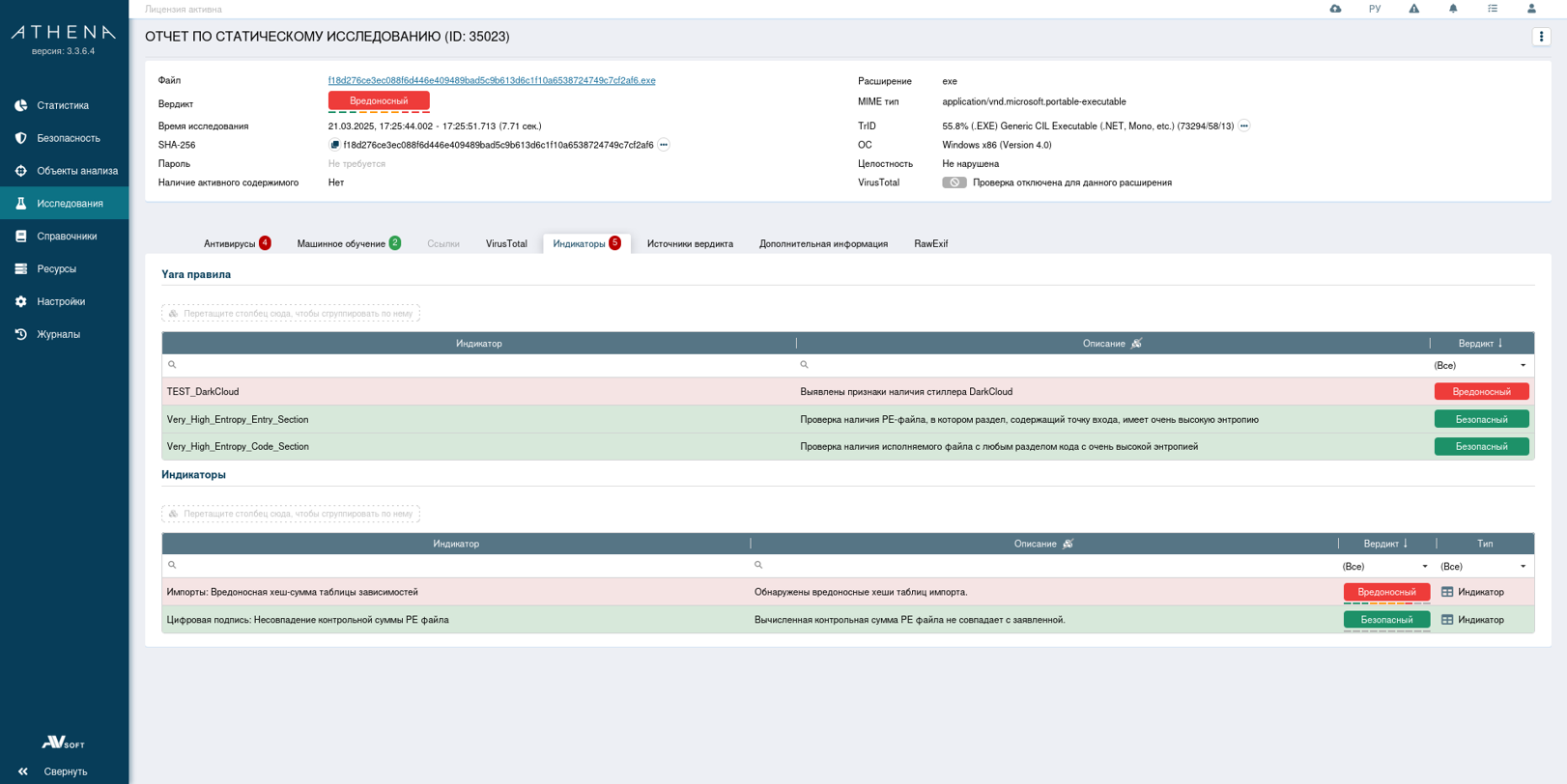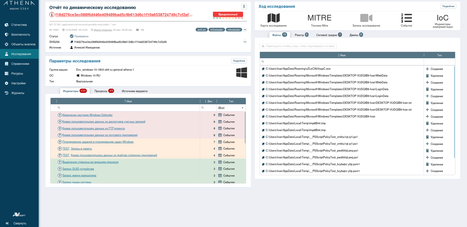 Динамический анализ в системе AVSOFT ATHENA выявил множество вредоносных индикаторов. Среди них отмечаются: