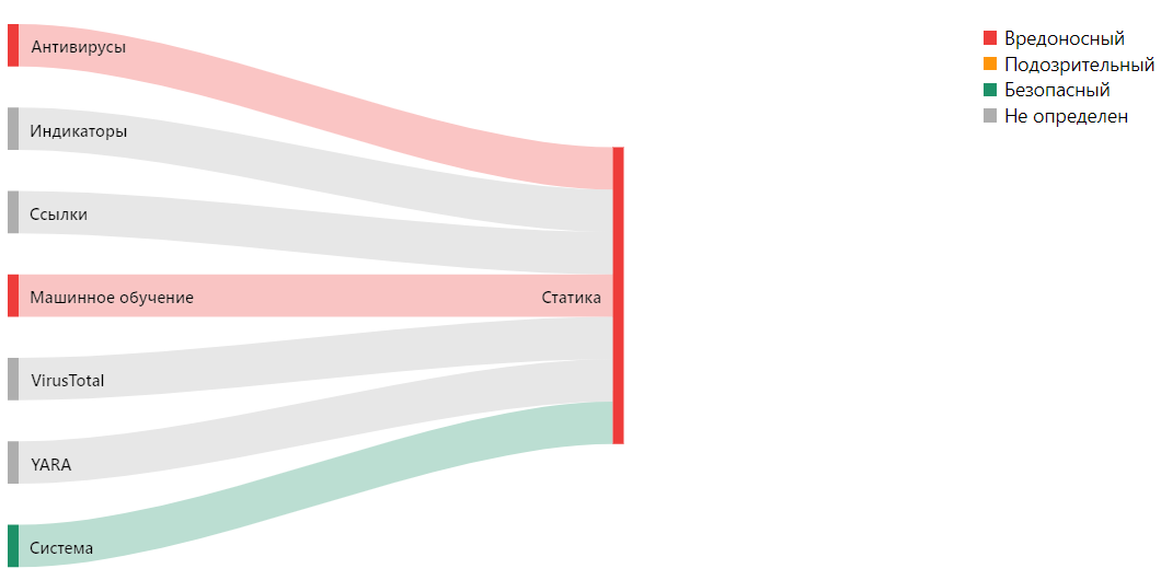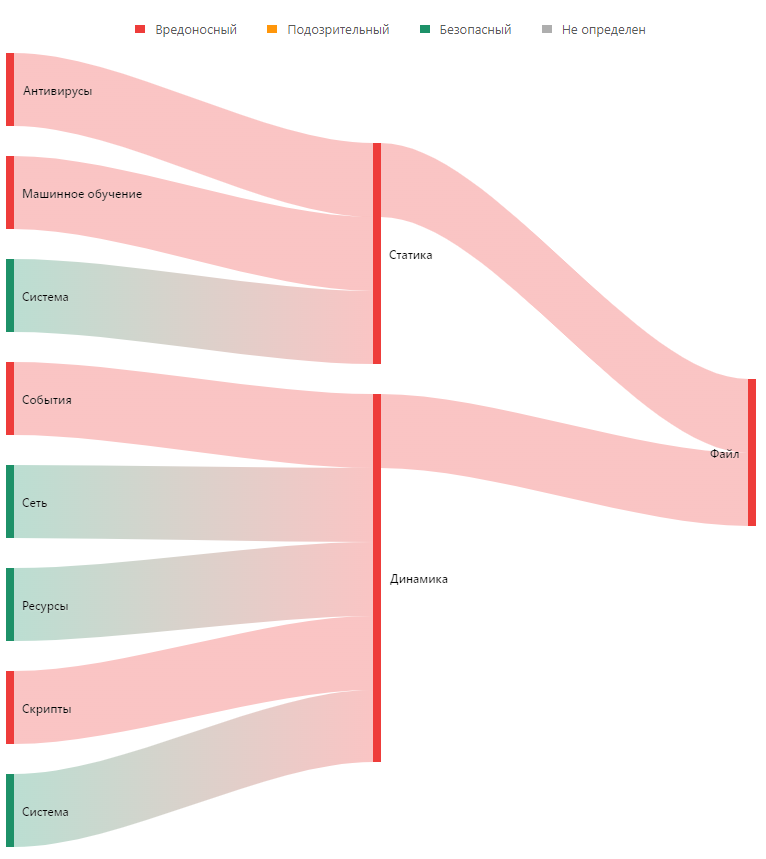 Во вкладке «Источники вердикта» строится графическая карта с источниками и их вердиктами (все кроме неопределенных), а также общим вердиктом по исследуемому файлу.