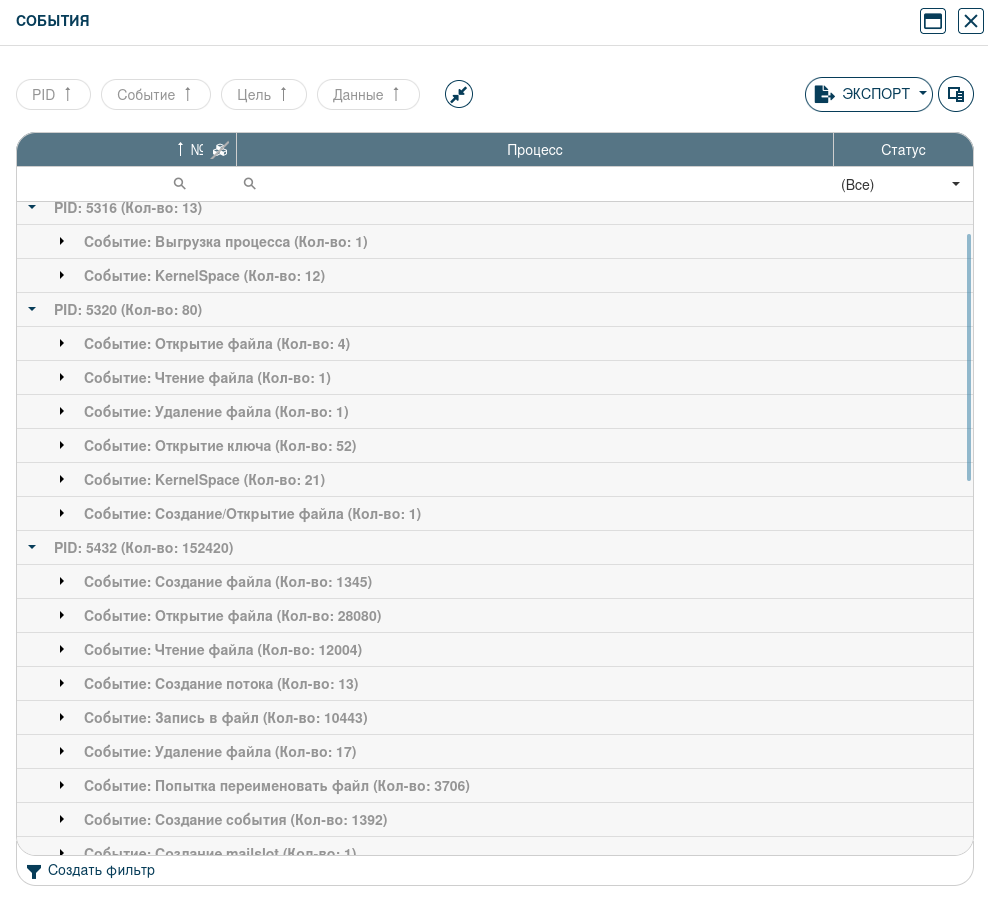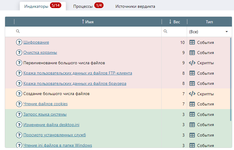 Во вкладке «События» отображаются конкретные процессы и события, которые происходят после запуска ВПО. На шифровальщик указывают следующие моменты: создание файла (1345 шт.), открытие файла (28080 шт.), запись в файл (10443 шт.) и попытка переименовать файл (10443 шт.).