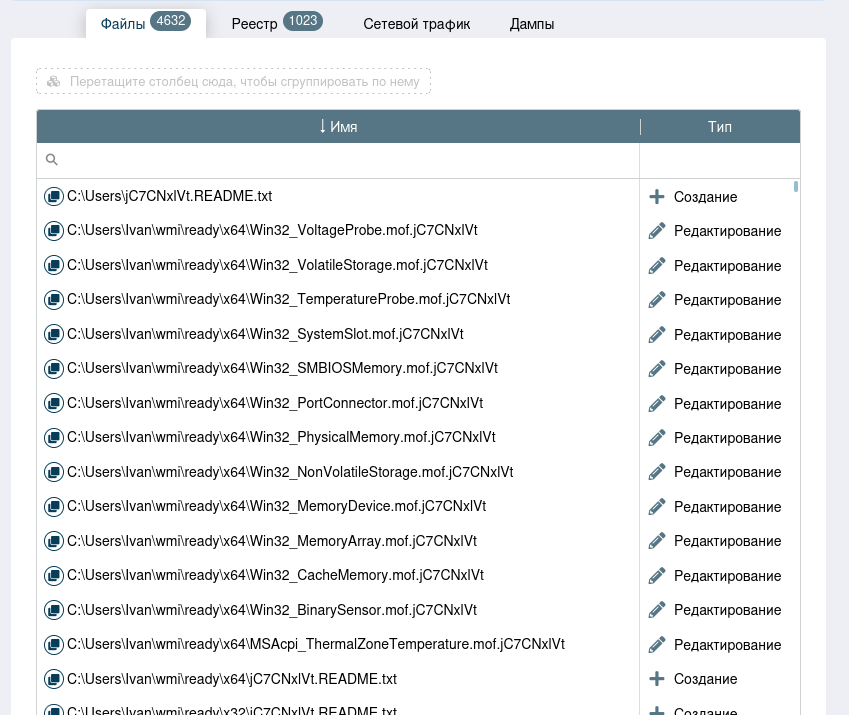 Во вкладке «Файлы» мы можем наблюдать какие файлы были созданы, какие отредактированы шифровальщиком.