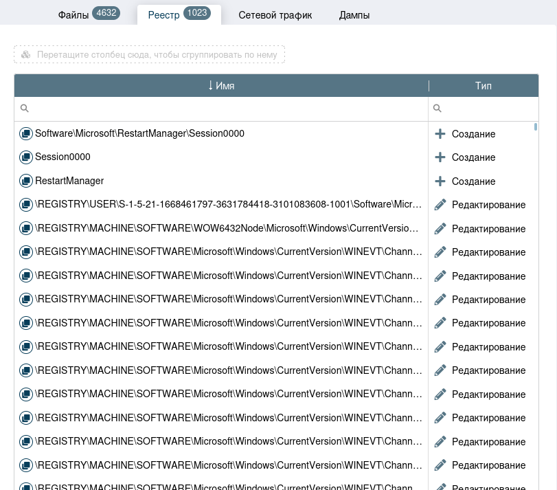 Вкладка «Реестр» показывает события в реестре операционной системы Windows.
