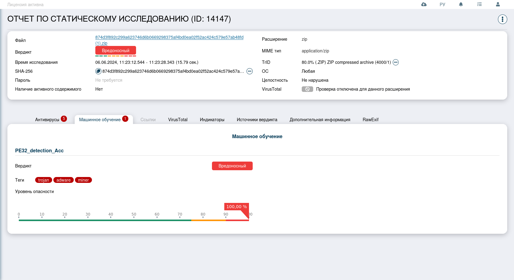Модуль машинного обучения также выдал вредоносный вердикт, указав теги: trojan, adware и miner.