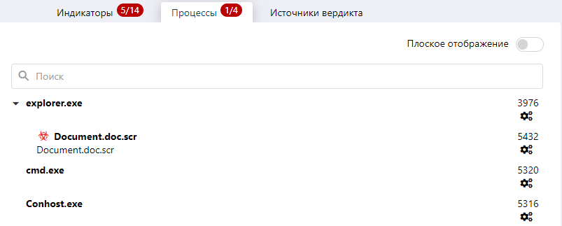 Среди системных программ, выявленных в процессе динамического исследования, были выявлены такие как: explorer.exe, Document.doc.scr (исполняемый скриптовый файл), cmd.exe.