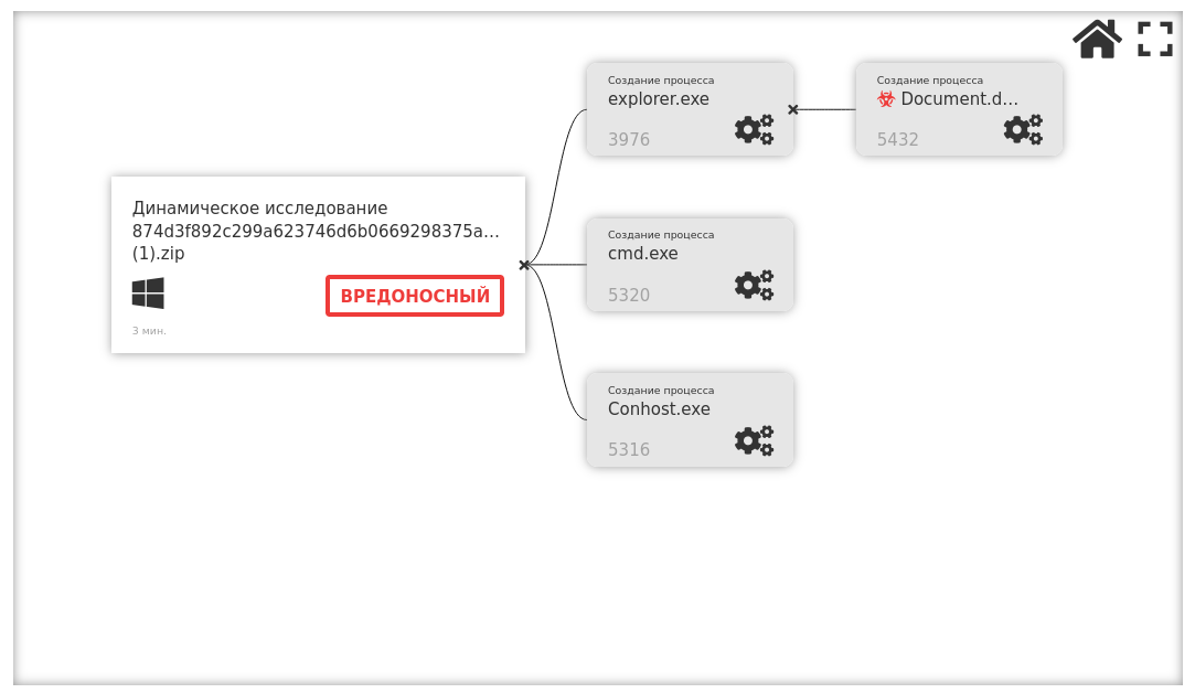 На карте исследования можно увидеть наглядно как и в какой последовательности проходят процессы после запуска вредоносного файла.