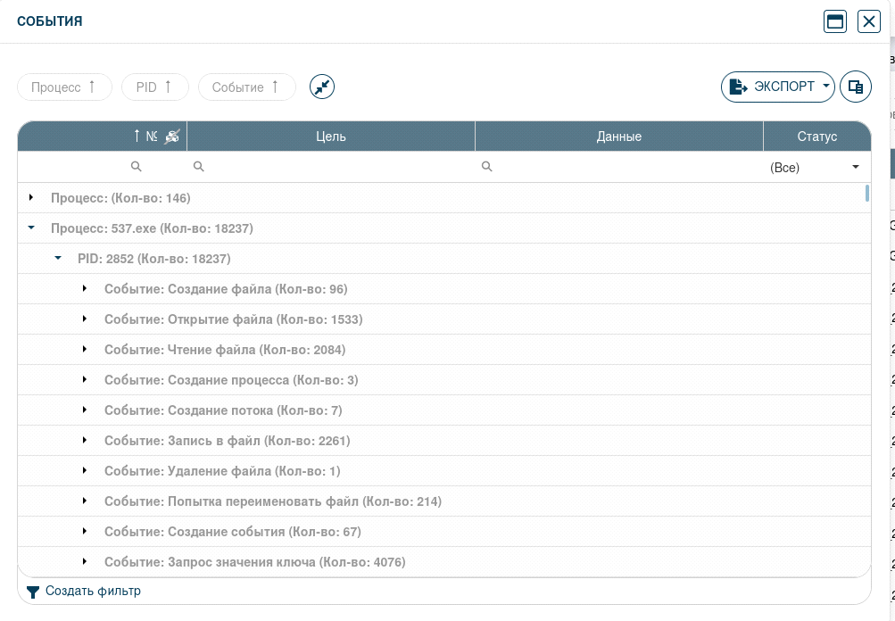 Во вкладке «События» отображаются конкретные процессы и события, которые происходят после запуска ВПО. На шифровальщик указывают следующие: открытие файла (1533 шт.), чтение файла (2084 шт.), запись в файл (2261 шт.), попытка переименовать файл (214 шт.)
