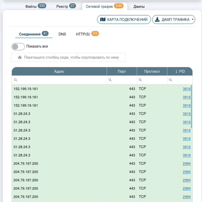 Во вкладке «Сетевой трафик» - «Соединения» представлены сетевые соединения