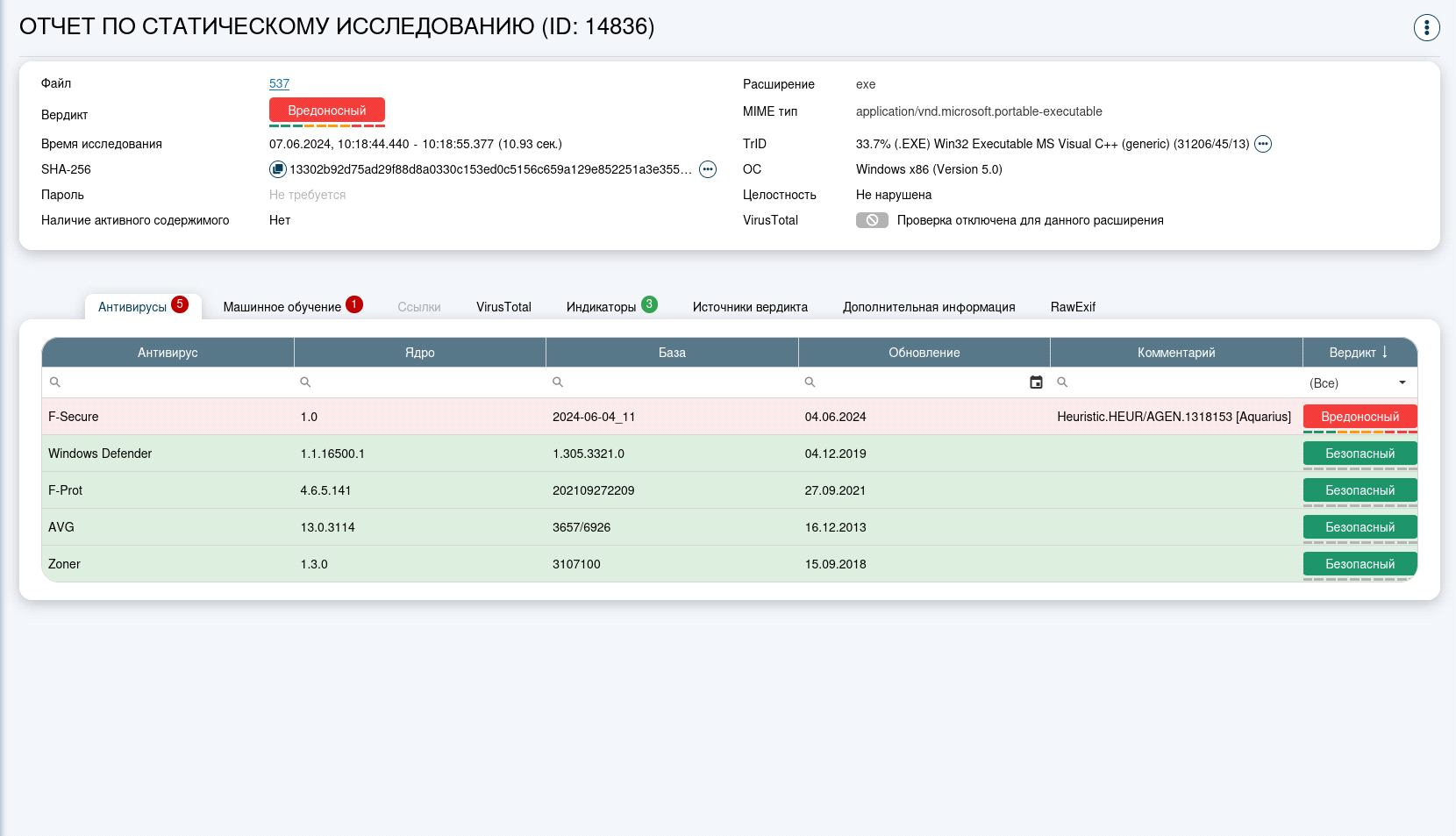 В ходе статического исследования файлу был присвоен вредоносный вердикт с помощью антивирусной проверки. Антивирус «F-Secure» выявил сигнатуру в исследуемом файле «Heuristic.HEUR/AGEN.1318153 [Aquarius]»