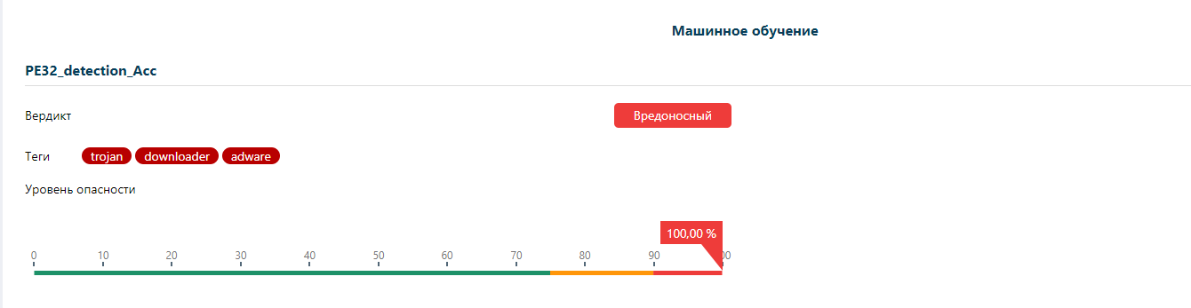 Во вкладке «Машинное обучение» модель обнаружила вредоносное содержимое, указав теги: trojan, downloader и adware