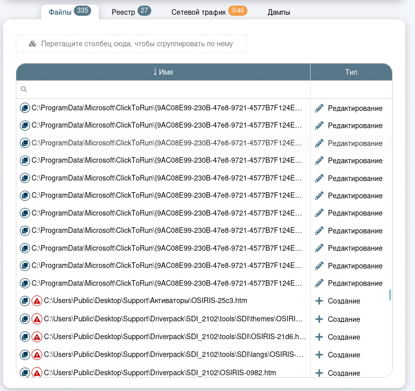 Во вкладке «Файлы» мы можем наблюдать какие файлы были созданы, какие отредактированы шифровальщиком