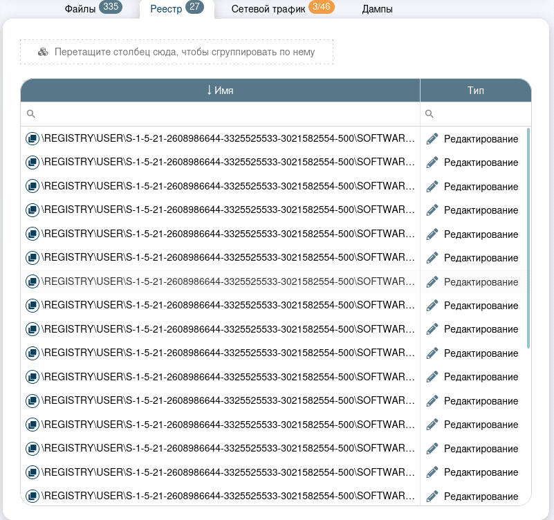 Вкладка «Реестр» показывает события в реестре операционной системы Windows