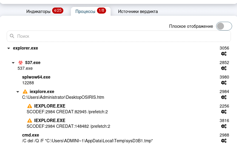 Вкладка «Источники вердикта» показывают все источники (статические и динамические), которые сработали и вынесли вредоносный, подозрительный или безопасный вердикт