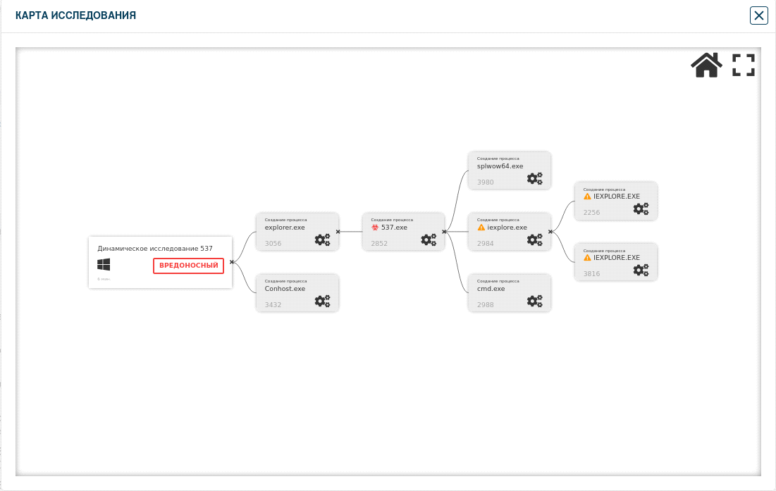 Во вкладке «Карта исследования» можно проследить наглядно, как и в какой последовательности проходят процессы после запуска вредоносного файла