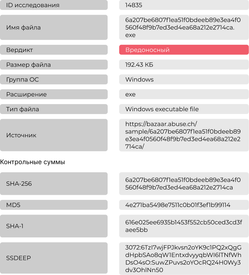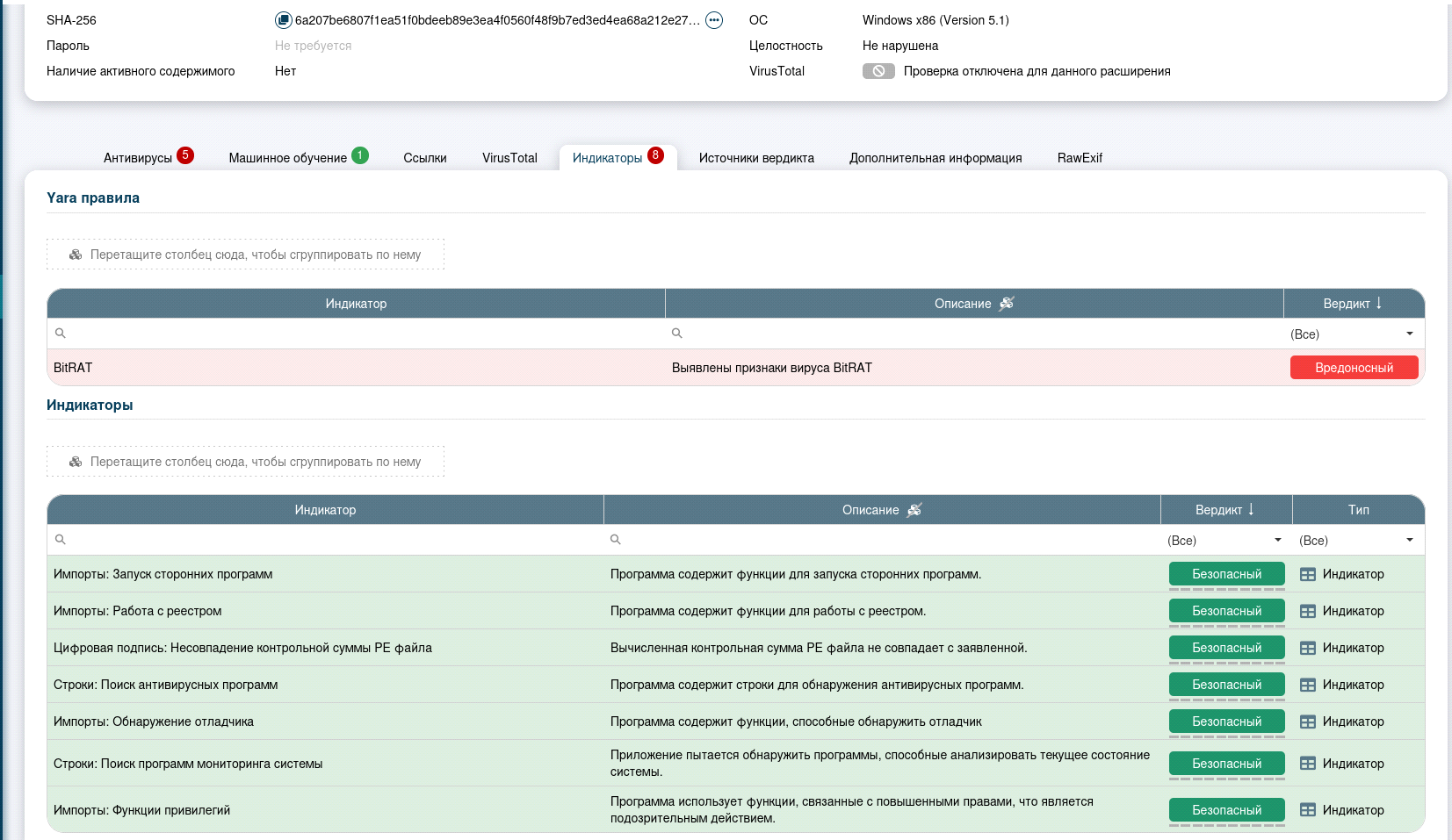 Среди индикаторов, которые отработали, стоит отметить Yara-правило, которое обнаружило признаки вируса трояна-банкера BitRAT