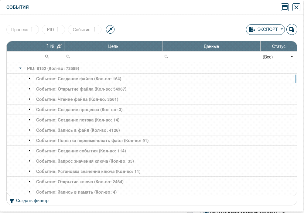 Во вкладке события, можем наблюдать, как вел себя вирус в системе. На шифровальщик указывают следующие моменты: создание файла (164 шт.), открытие файла (54967 шт.), запись в файл (4126 шт.)