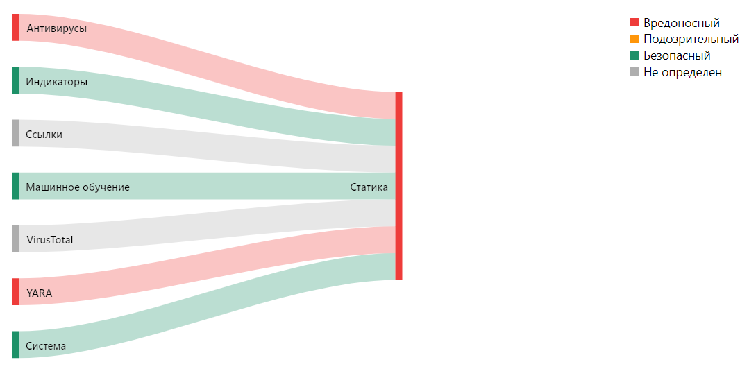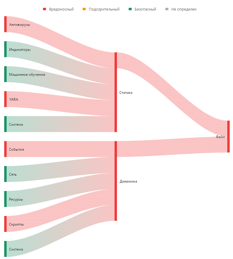 Во вкладке «Источники вердикта» строится графическая карта с источниками и их вердиктами, а также общим вердиктом по исследуемому файлу