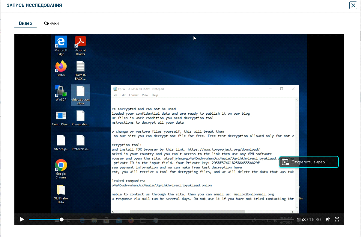 С помощью вкладки «Запись исследования», можно посмотреть, что произошло после запуска шифровальщика Mallox. После шифрования файлов системы, ПО создает текстовый файл, в котором злоумышленники оставляют информацию по поводу расшифровки и т.п
