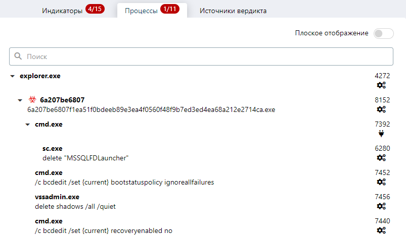 Среди системных программ, выявленных в процессе динамического исследования, были выявлены такие как: 6a207.exe — сам исполняемый файл, sc.exe — которая извлекает и задает сведения об управлении службами, vssadmin.exe — для теневого копирования томов