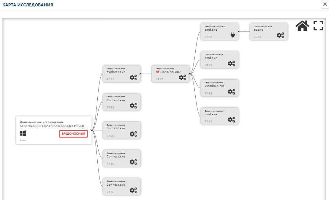 Во вкладке карта исследований можно увидеть, как и в какой последовательности проходят процессы после запуска вредоносного файла