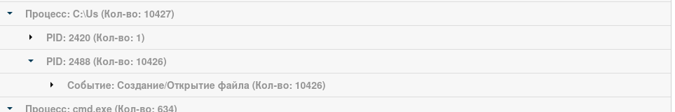 Во вкладке «События» отображаются конкретные процессы и события, которые происходят после запуска ВПО. На шифровальщик указывают следующие моменты: создание/открытие файла (10426 шт.).