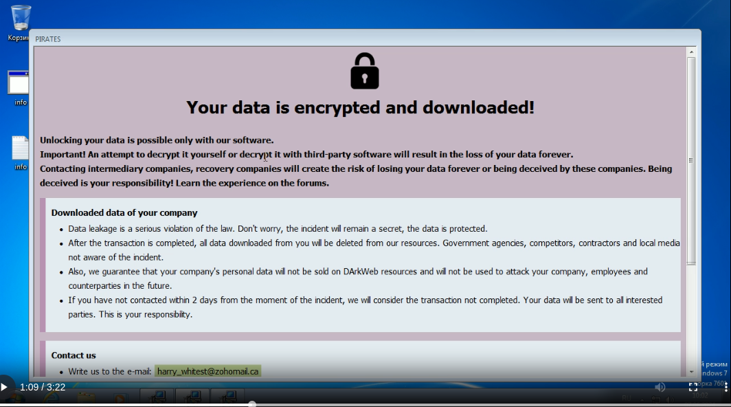 После заражения, на рабочем столе жертвы периодически появляется окно с угрозами, требованием выкупа и контактами для получения программы для дешифровки.