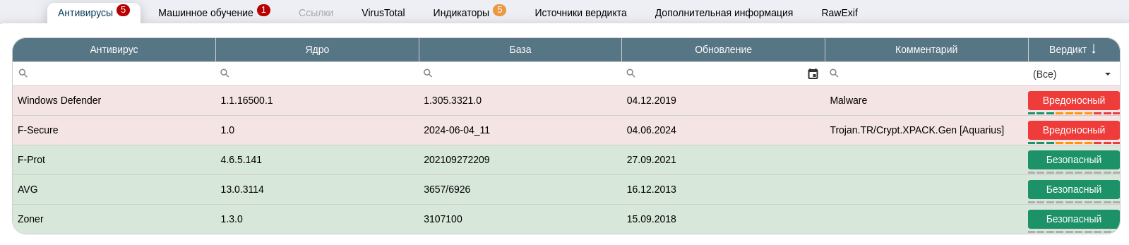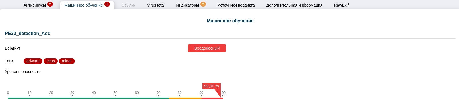Модуль машинного обучения тоже выдал вредоносный вердикт, указав теги: adware, virus, miner.