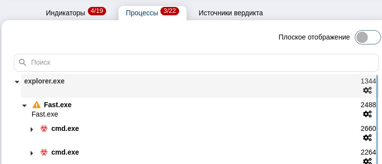 Вкладка «Источники вердикта» показывают все источники, относящиеся к динамическому анализу, которые сработали и вынесли вредоносный вердикт.