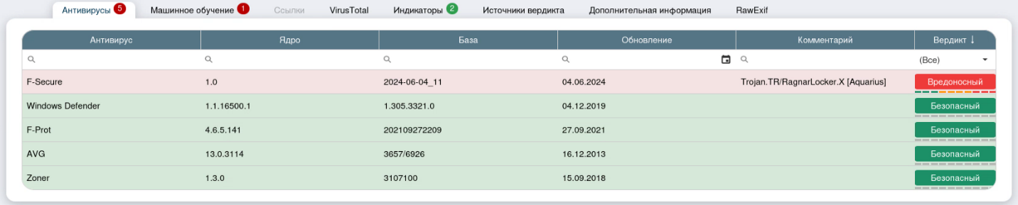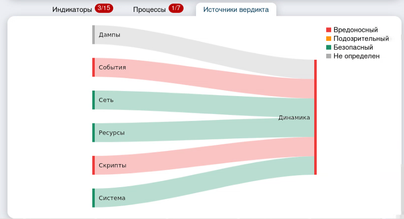 Вкладка «Источники вердикта» показывают все источники (статические и динамические), которые сработали и вынесли безопасный, подозрительный или вредоносный вердикт