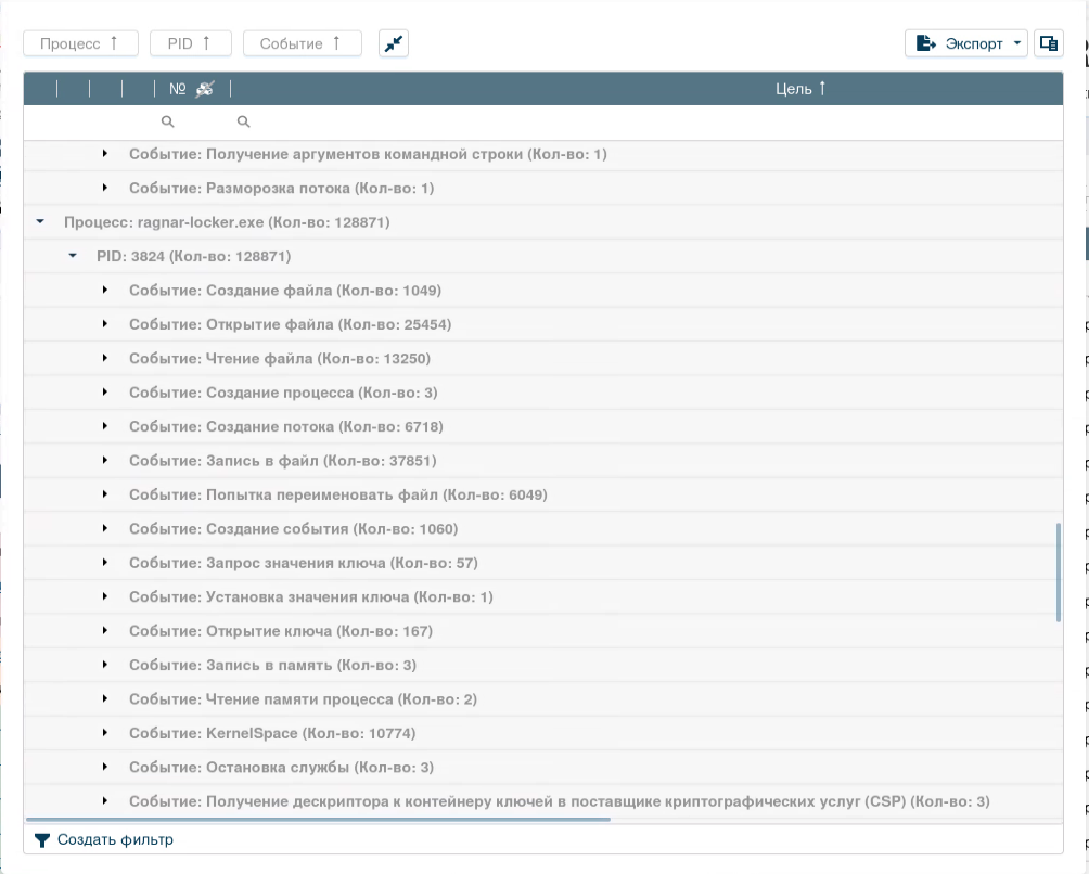 Во вкладке «События» отображаются конкретные процессы и события, которые происходят после запуска ВПО. На шифровальщик указывают следующие моменты: создание файла (1049 шт.), открытие файла (25454 шт.), запись в файл (37851 шт.) и попытка переименовать файл (6049 шт.)