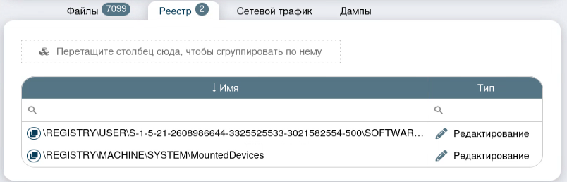 Вкладка «Реестр» показывает события в реестре операционной системы Windows
