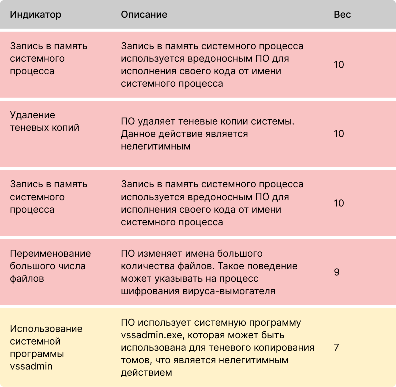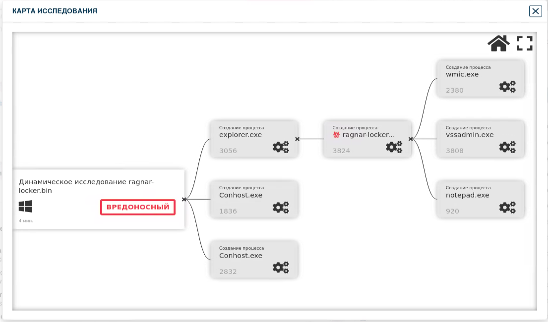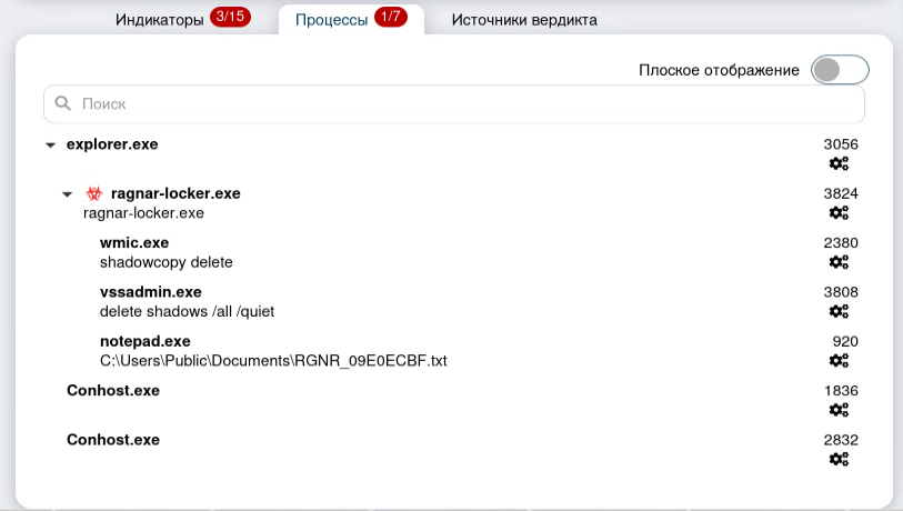 Среди системных программ, выявленных в процессе динамического исследования, были выявлены такие как: explorer.exe и ragnar-locker.exe (сам файл), wmic.exe, vssadmin.exe, notepad.exe, Conhost.exe