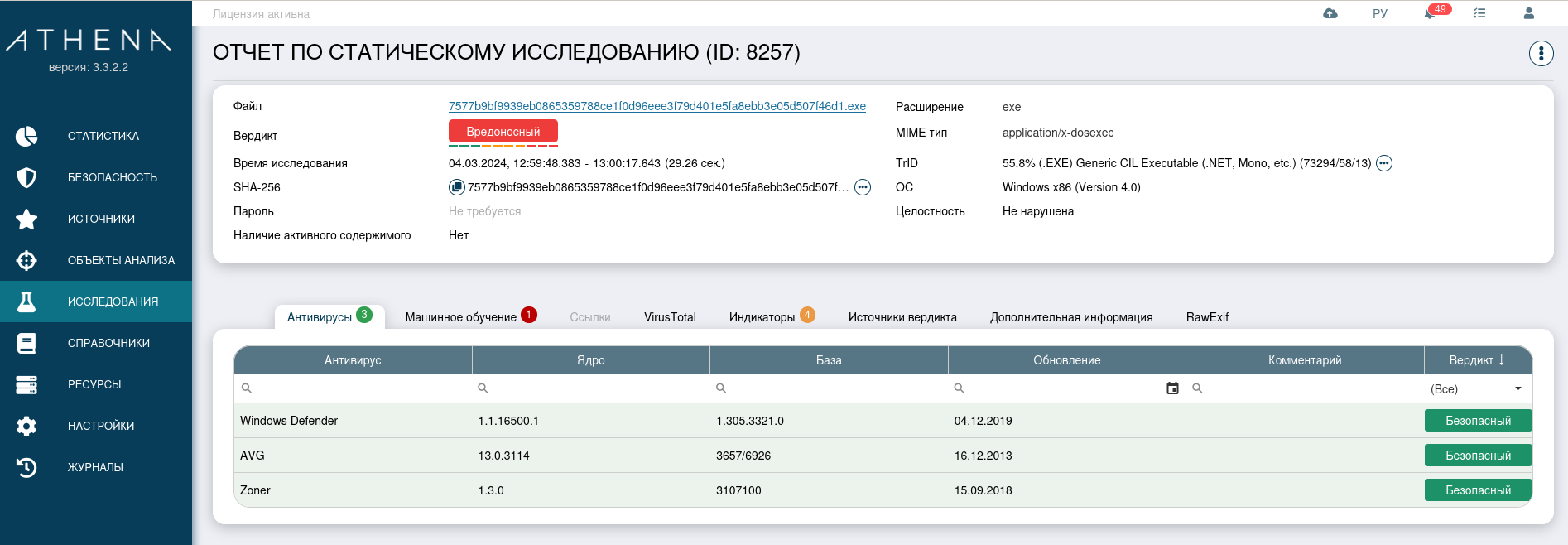 Исследования файла происходило с помощью системы AVSOFT ATHENA и ручного исследования (реверс-инжиниринг). Для начала посмотрим на статический и динамический анализ файл в системе ATHENA.