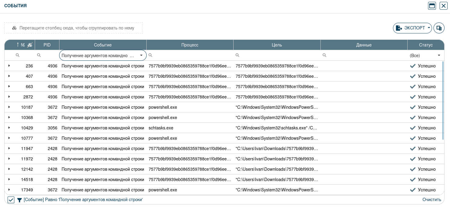 Во вкладке «События» отображено, что при запуске вредоносного файла открывается командная строка и срабатывает процесс powershell.exe. Средство командной строки powershell.exe запускает сеанс Windows PowerShell в окне командной строки. Скрипт PowerShell может быть очень эффективным способом передачи вредоносных исполняемых файлов и вредоносных документов. PowerShell скрипты обычно используют обфускацию и кодирование для скрытия процесса.