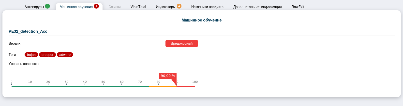 Машинное обучение выявило, что файл вредоносный и содержит те-ги семейств троян, дроппер (файл-носитель, устанавливающий вирусную программу в систему) и рекламного ПО.