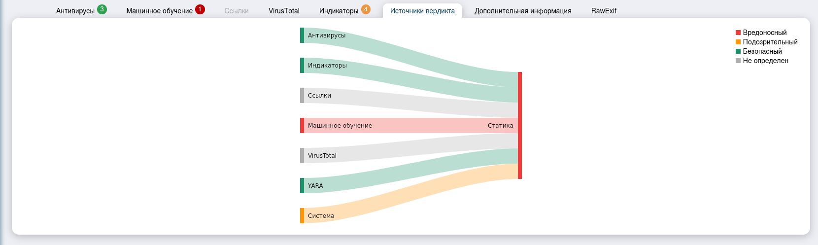 Со вкладкой «Источники вердикта» стоит просто ознакомиться, она несет в себе информацию о том, какие методы и модули статического ана-лиза выдали вердикт после проверки данного ПО.