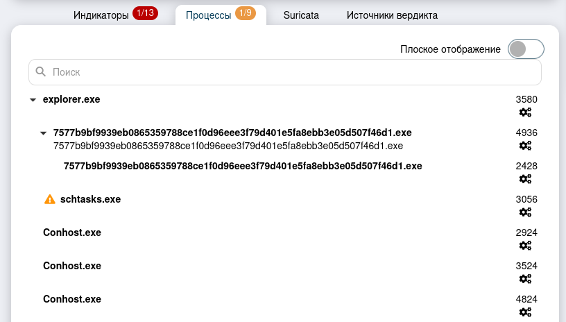 Во вкладке «Индикаторы» указано несоответствие вердиктов ма-шинного обучения и антивирусов, что является причиной подозрительно-го вердикта.