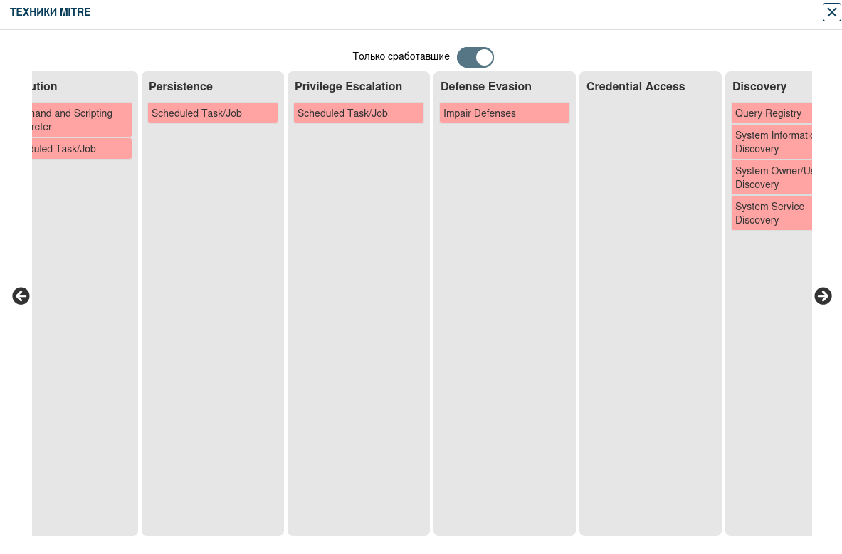 Во вкладке «Техники MITRE» видно, что отработало несколько техник: