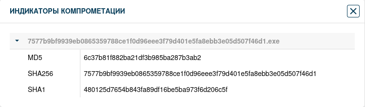 Во вкладке «Индикаторы компрометации» отображаются индикаторы компрометации вредоносного поведения файла по результатам его проверки в «песочнице».