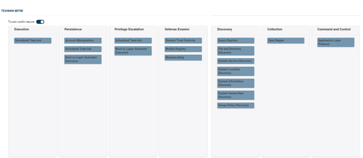 Во вкладке «Техники MITRE» видно, что отработало несколько техник.