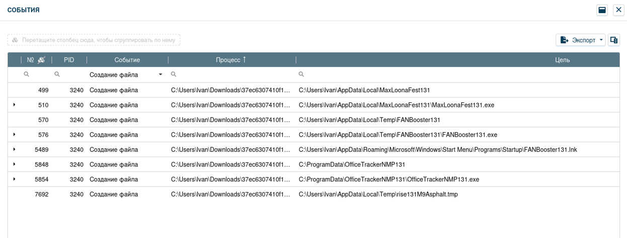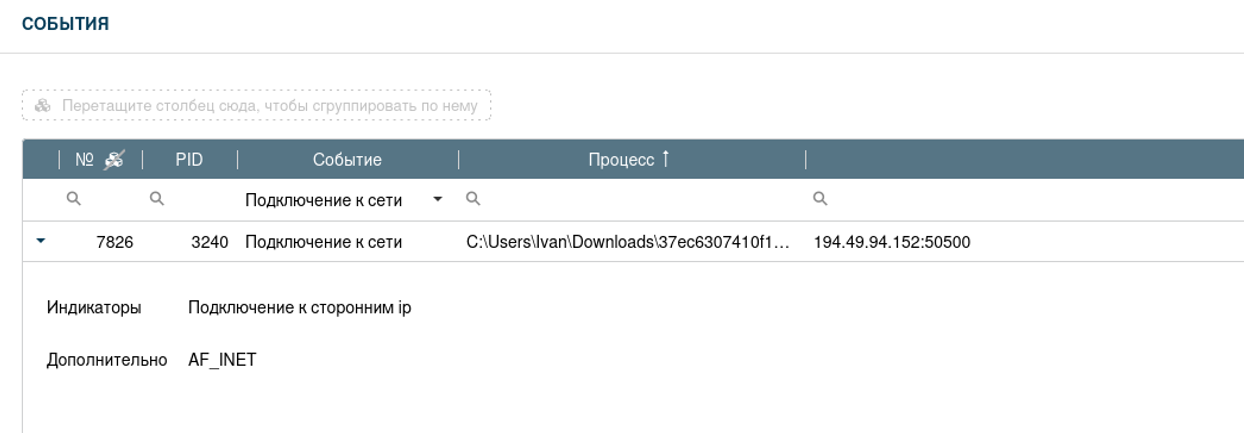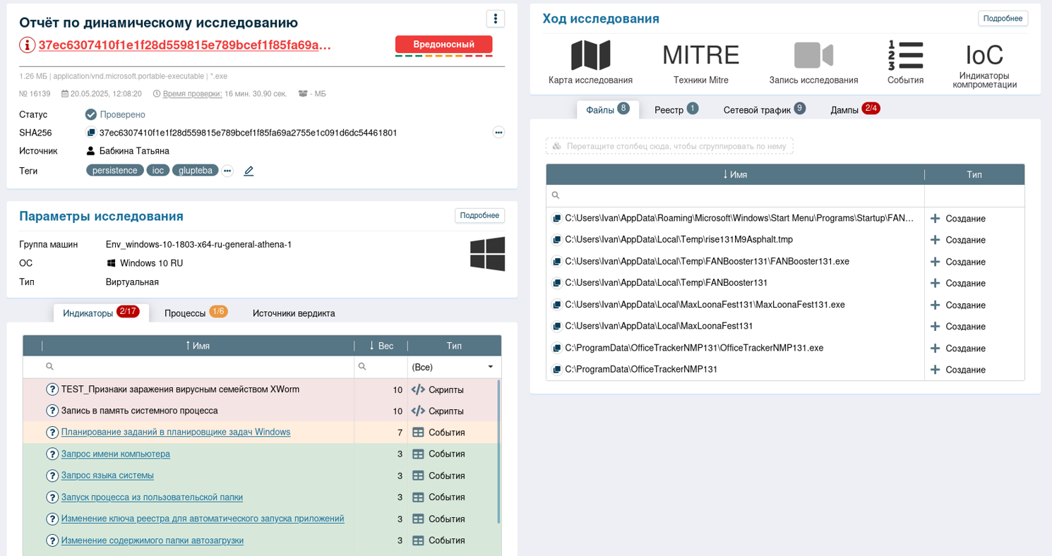 3) индикатор «Признаки заражения вирусным семейством XWorm» - действия, совершаемые во время работы ПО в файловой системе, очень похожи на действия, совершаемые при работе вирусного программного обеспечения XWorm.