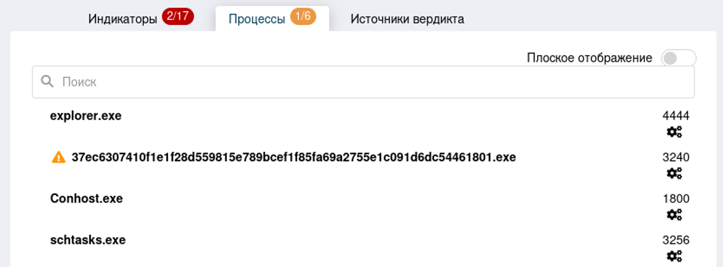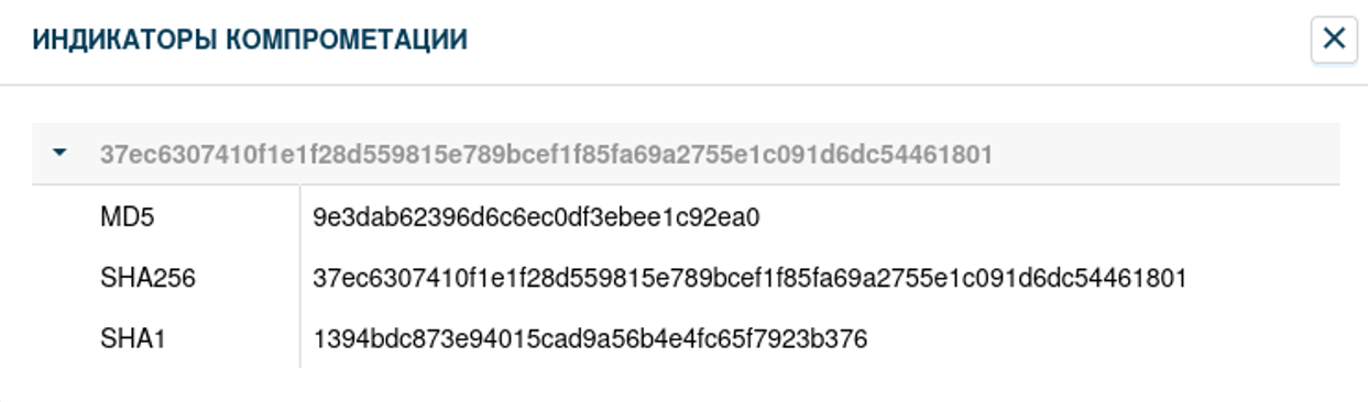 Во вкладке «Индикаторы компрометации» отображаются индикаторы компрометации вредоносного поведения файла по результатам его проверки в «песочнице».